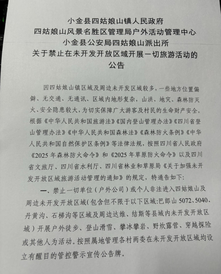 值得注意的是,早在今年9月25日,小金县四姑娘山镇人民政府、四姑娘山风景名胜区管理局户外活动管理中心、小金县公安局四姑娘山派出所就已联合发布《关于禁止到未开发开放区域开展一切旅游活动的公告》。公告明确指出,四姑娘山区域未开发区域“位置偏僻、无交通、无通讯、区域内地形复杂,山洪、地灾、森林防灭火、安全隐患较大”。