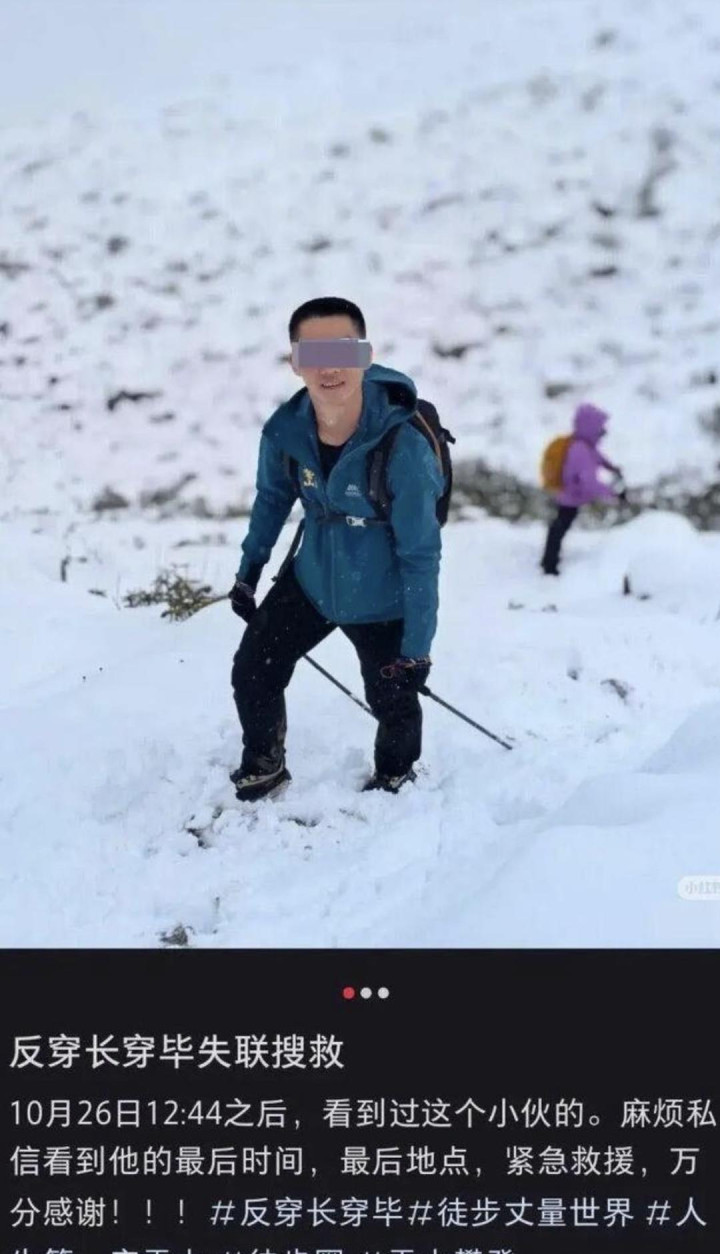 据知情网友透露,思某某在10月25日完成一项比赛后,于26日相约伙伴进行反穿。有知情者表示:“他一直在队里照顾比较弱的伙伴,出了事很可惜。”最后与思某某取得联系的时间是10月26日11点36分。
